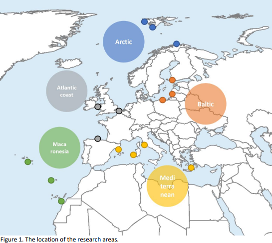 During 2023 in total 231 stakeholders were consulted in 15 research areas (Fig. 1) within the MARBEFES and Marine SABRES projects on their viewpoints regarding the balance between the ecology, society and economy in their marine coastal environment, and the pressures acting on it. The research areas were distributed over 5 major regions: Macaronesia, Mediterranean, Atlantic Coast, Baltic, and Arctic. The stakeholders belonged to 4 major categories, i.e., public audience and NGOs, public authorities, industry and private sector, and academia and research.